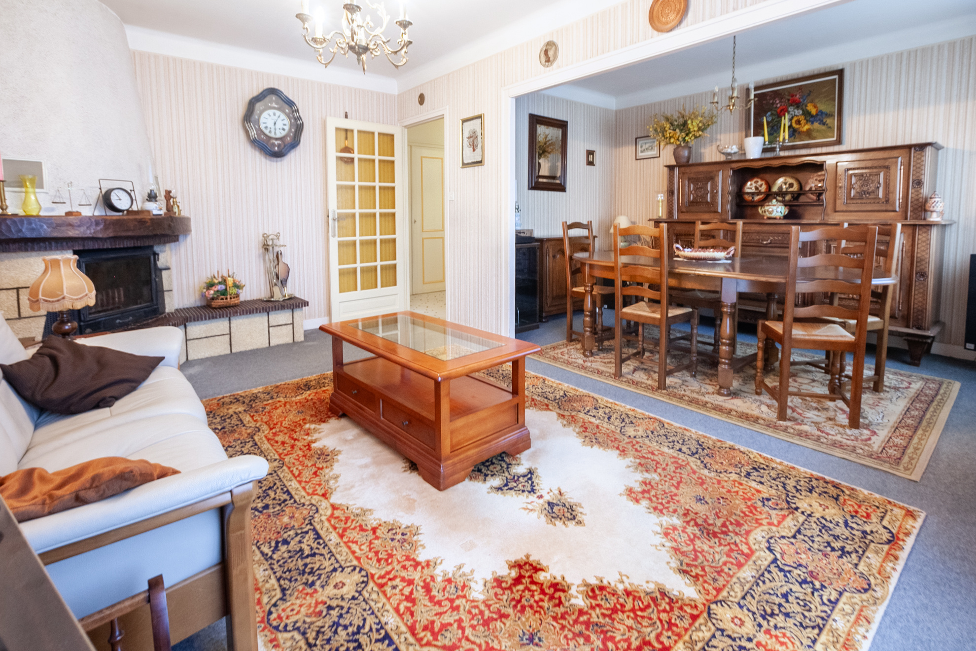 A l'étage, un dégagement avec placard, un salon - salle à mangeravec cheminée, une grande cuisine, 2 chambres, salle d'eau et WC.